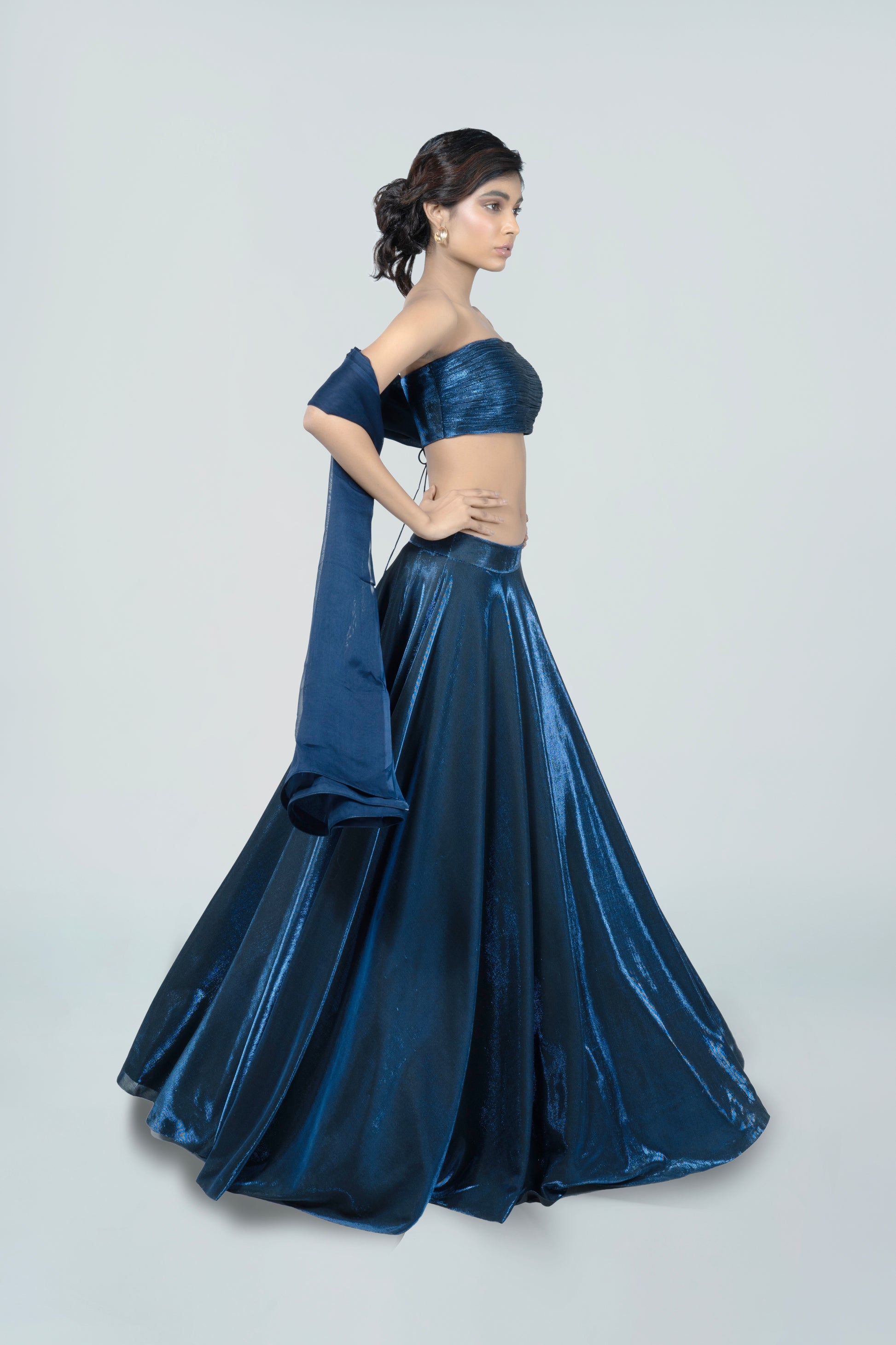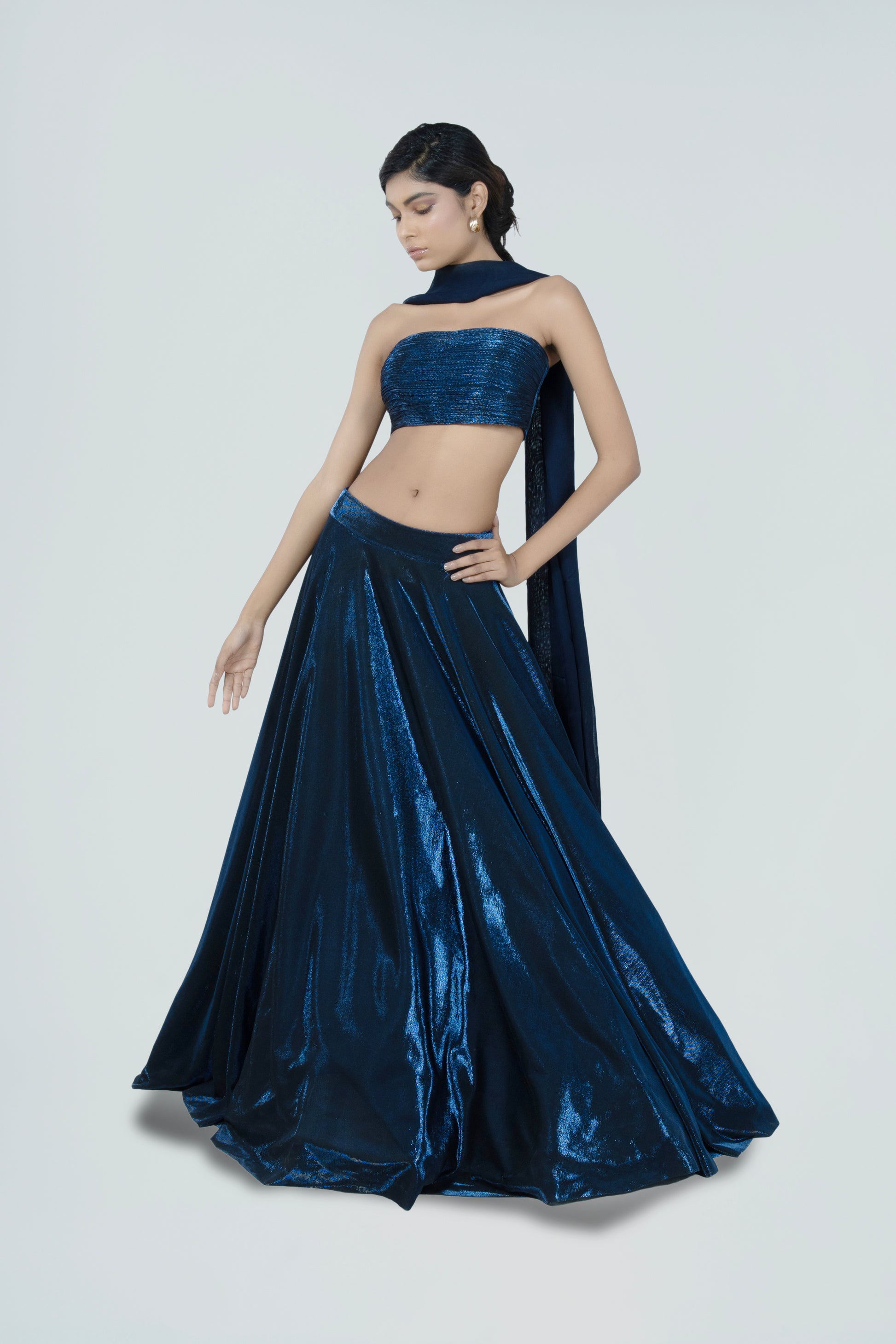 The navy blue birkin lycra lehenga is a finely crafted for a sensual yet sophisticated look. Paired with a matching dupatta.
